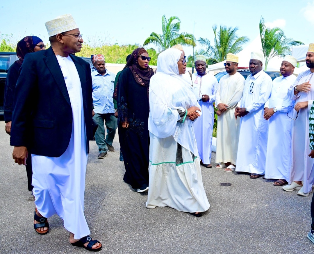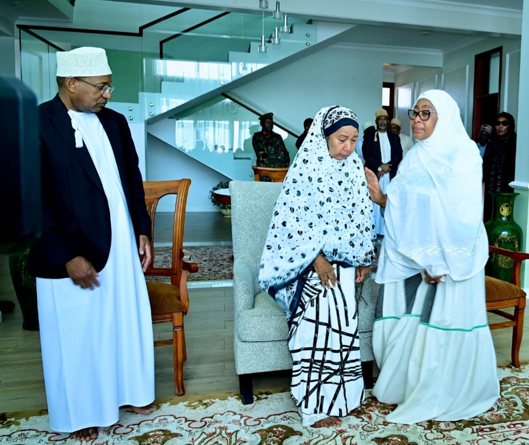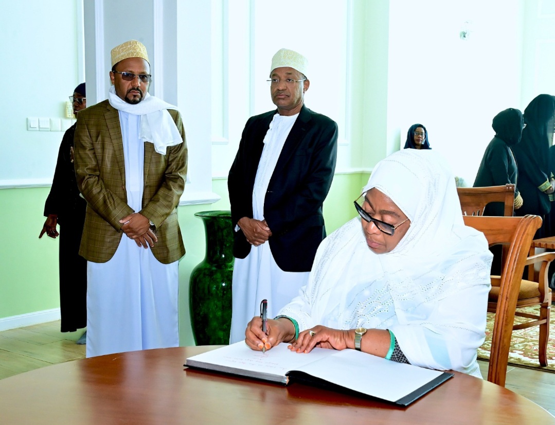 Mgombea nafasi ya Urais wa Jamhuri ya Muungano wa Tanzania kwa tiketi ya Chama Cha Mapinduzi CCM Dkt. Samia Suluhu Hassan, akisaini Kitabu cha kumbukumbu ya maombolezo pamoja na kumfariji Mama Siti Mwinyi pamoja na familia ya hayati Mzee Ali Hassan Mwinyi wakati alipofika Bweleo Wilaya ya Magharibi B, Mkoa wa Mjini Unguja kwaajili ya kuifariji familia hiyo kufuatia kifo cha Kaka yao Hayati Abass Ali Mwinyi leo Ijumaa Septemba 26, 2025.